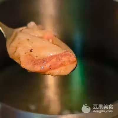 2、使用奶鍋,基本小半奶鍋的油,油溫六成熱時,調好的肉盛入大勺,輕輕將大勺內的肉滑入油中。肉炸到浮起來,翻面再炸。炸到外表發硬,8成熟撈出。