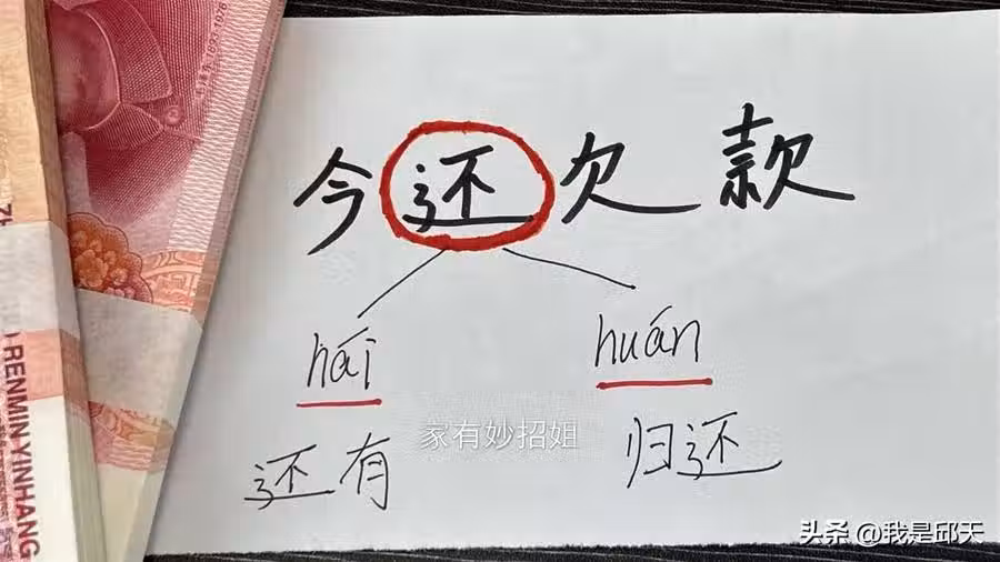 但如果讀「hái」時,它就表示還有20萬元欠款沒還。所以,別看這一個字,它的意思卻是天壤之別。我們在書寫這個字的時候,就要特別注意,要把它寫清楚了。如果表示「huán」,我們就可以寫「歸還」,表示「hái」時,就可以寫「還有」,這樣它的意思就更加明確,不會出錯了。