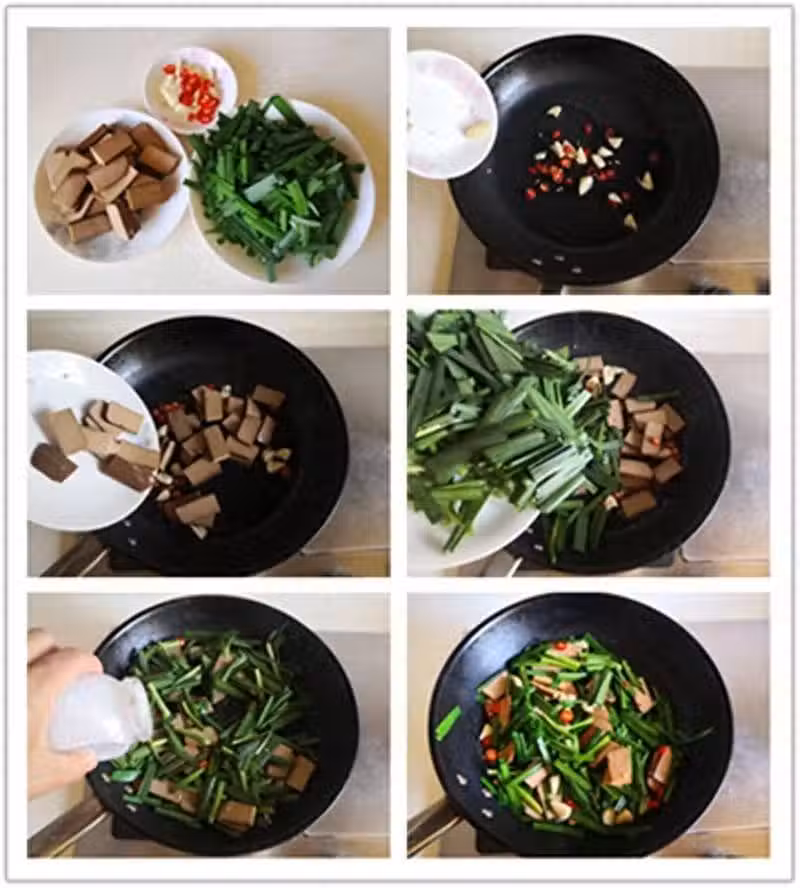 3. 加入韭菜後大火快炒翻炒, 微微變色後加入鹽調味, 翻炒均勻即可。