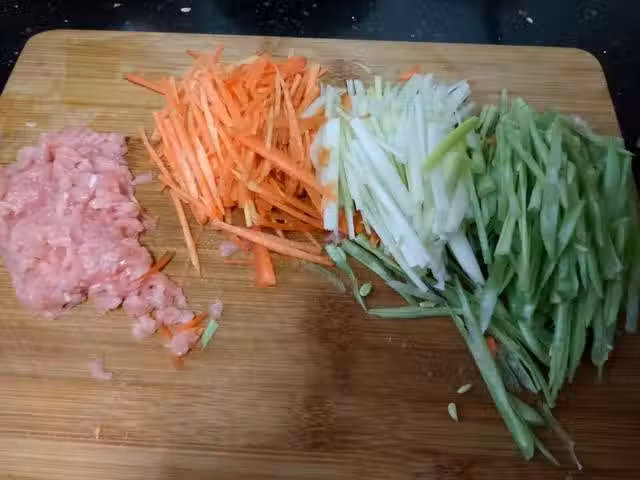 6.接下去炒點配菜。四季豆、胡蘿蔔、大蔥、瘦肉切絲。