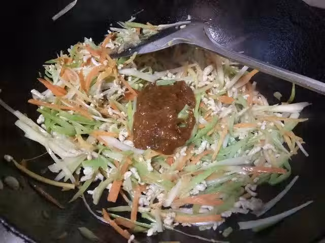 10.放入少許料酒,最後放入2大勺黃豆醬,翻炒均勻,盛出。