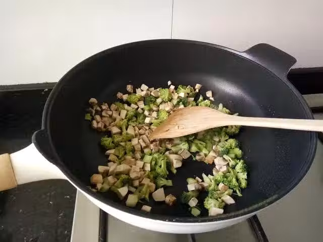5.西蘭花和蘑菇也稍微炒下,斷生,盛起。