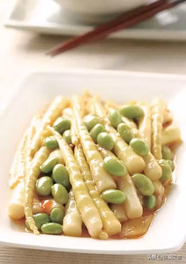 1 劍筍洗凈用菜刀略拍打過,和毛豆一起放入沸水中汆燙備用。