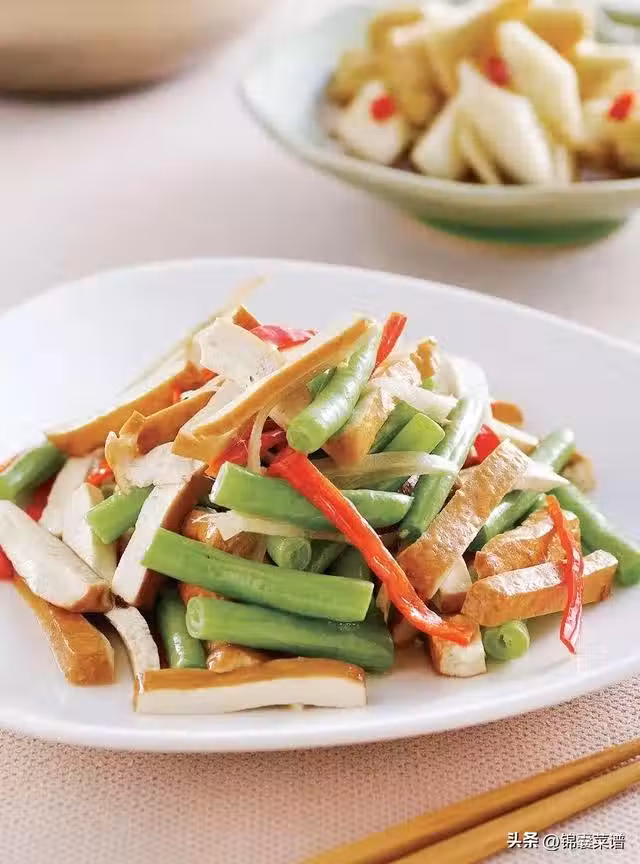 豆角 120 克,豆乾絲 60 克,紅甜椒絲 20 克,薑絲 5 克