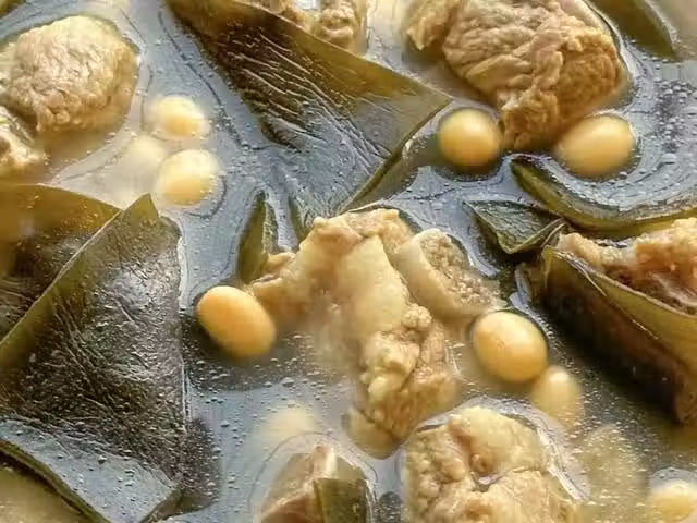 3、將黃豆和薑片放入湯鍋中,加入適量的清水,先開大火煮開,再轉成小火燉煮一個小時。接著再將海帶放進來煮二十分鐘。