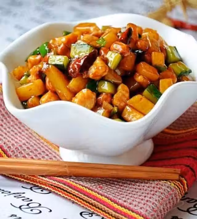 13.加入花生米,淋入水澱粉翻炒均勻。