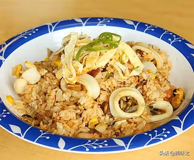 各種海鮮100g、剩米飯1碗、干瑤柱6顆、雞蛋1個、蘑菇1個、洋蔥半個、玉米粒適量、橄欖油適量、鹽適量、白糖適量、生抽適量、黑胡椒粉適量、烤肉醬適量。