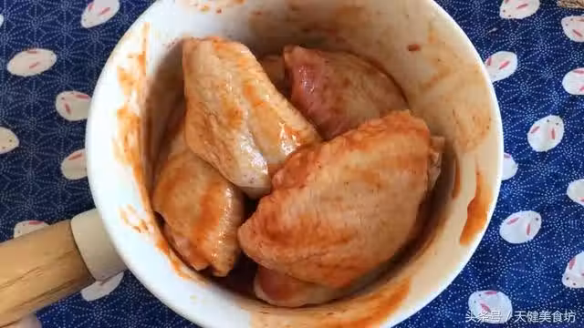 把雞翅裝到一個較大的容器裡面去,然後加入準備好或者自己做的腌料,帶個手套,用手把雞翅跟腌料抓勻,讓雞翅完全裹上一層腌料,再腌制20分鐘以上。如果你不著急吃的話,可以用保鮮膜包起來,放到冰箱保鮮格腌制一個晚上更佳!