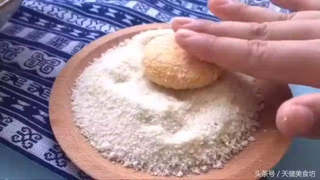 壓扁後,南瓜餅的大致形狀就做好了,最後別忘了裹上一層麵包糠,將壓扁的南瓜麵糰放入裝滿麵包糠的碟子裡面,四面翻動,讓南瓜麵糰完完全全的裹上一層麵包糠,這樣一個生的南瓜餅就做好了!