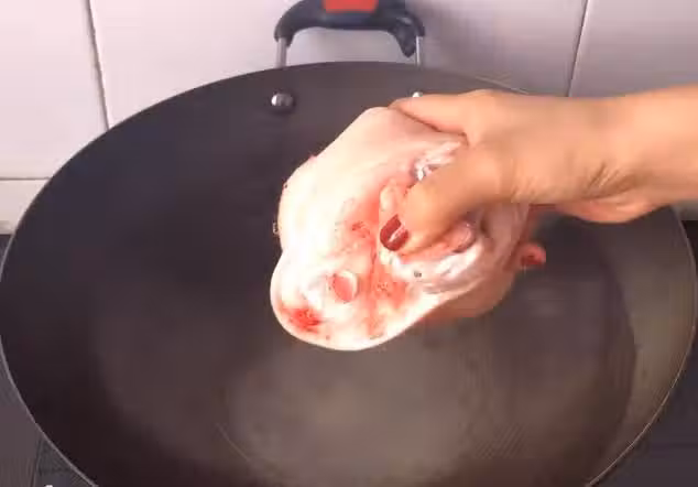 我們再換一個方向繼續放在鍋里擦一擦,在探的時候我們要注意不要燙到手,我們把豬皮都燙一遍看這樣是不是就非常的干凈。這是因為鐵鍋的導熱性是非常強的,可以將上面的豬毛都給探掉,用這個方法可以輕松的去除豬毛,下次你也去試試這個方法好了。