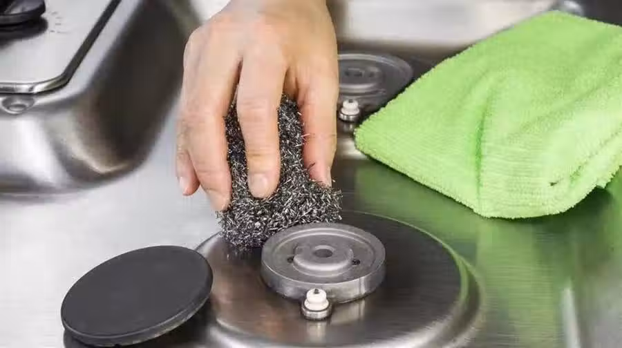 接著再拿出白醋,倒在有小蘇打的地方,讓小蘇打和白醋反應,這樣可以軟化上面的油漬和油污,我們在使用百潔布來擦拭就可以輕松的將這些油脂給溶解下來,後面我們再使用百潔布來刷洗之後,就可以用毛巾或者廚房用紙將它擦拭乾凈了。