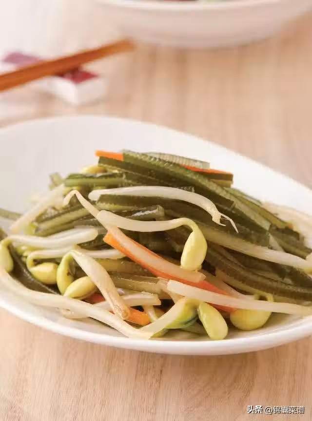 海帶絲 120 克,黃豆芽 100 克,胡蘿蔔絲 20 克,芹菜段 15 克,薑絲 10 克