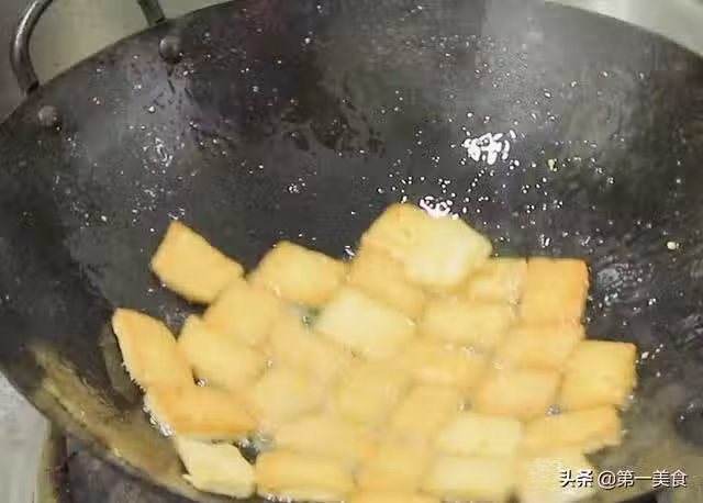 倒入煎好的豆腐和蔥花,讓豆腐裹上料汁翻勻後,一般香噴噴的煎豆腐就做好了。