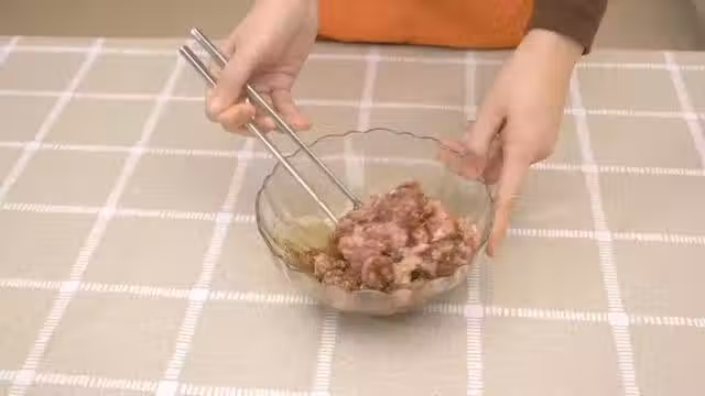 6、加入澱粉,繼續按同一方向攪拌,直到澱粉和肉餡融合均勻