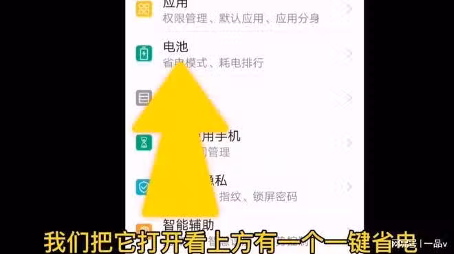 如果你出門在外,手機的電量很少,怕關機,我們就打開手機的設置,然後往上滑,注意看下方有一個「電池」,我們把它打開,看上方有一個「一鍵省電」,我們把它打開!