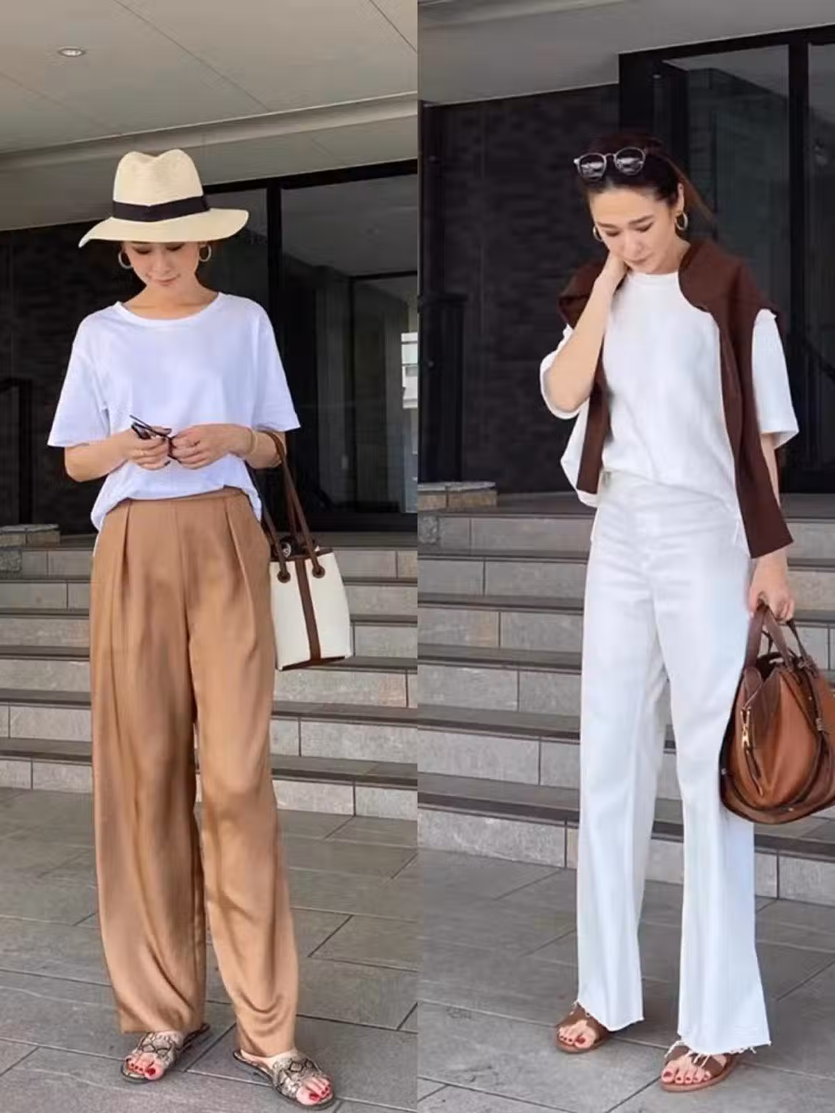 純色T恤、闊腿褲、牛仔褲都可以供50歲女人選擇,穿在身上休閑舒適又減齡,純色搭配還能讓你的造型看起來一目了然,實在太氣質了。上面這兩套搭配都蠻值得借鑒,既舒適日常,又能凸顯不俗品味。
