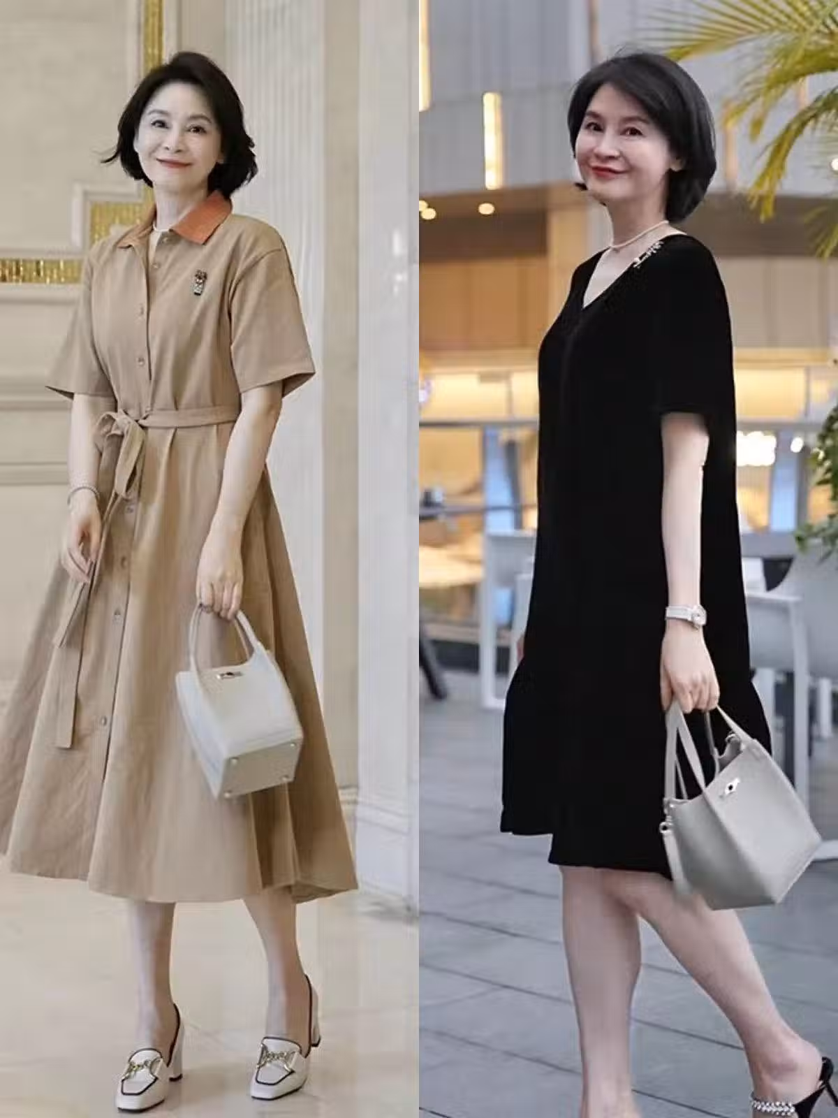 除了小白裙外、卡其色、淺駝色、黑色等經典色系的連衣長裙也很適合60歲女人,除了剪裁干凈外,這些裙裝的材質也不能太粗劣,特別是半透明材質的裙子,盡量少穿。