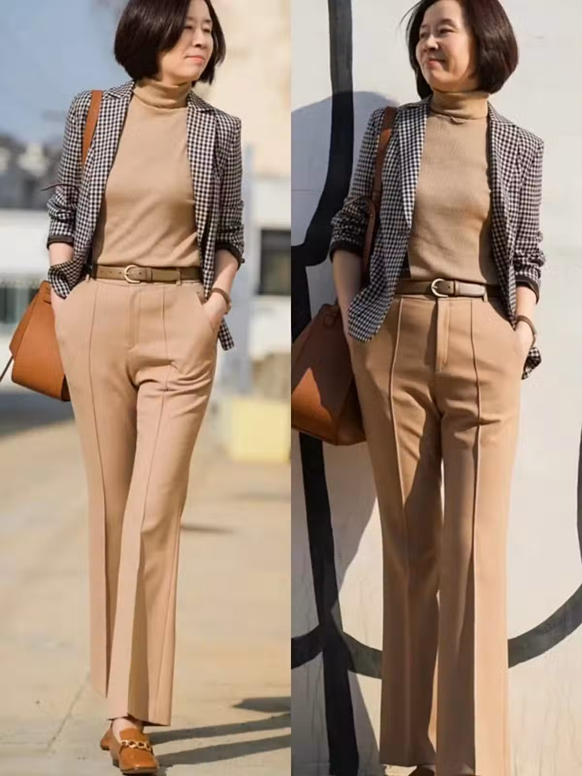 首先推薦大家試試大地色系高腰壓褶西裝長褲,微喇褲型修飾小腿線條,加上高腰和壓褶設計,輕松穿出大長腿。