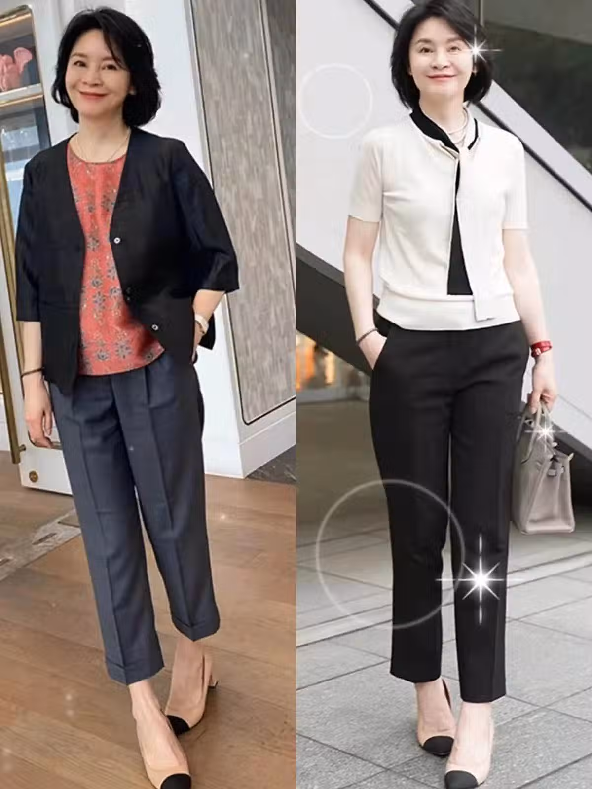 個頭不高的中老年人一定要優先搭配粗跟奶奶鞋,進一步優化身材比例。
