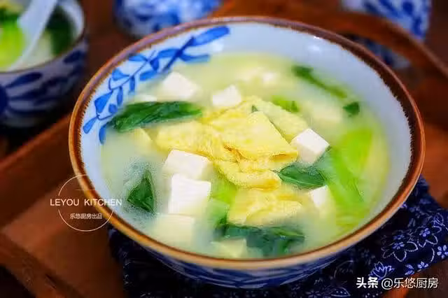 第一步:準備食材。雞蛋3個、嫩豆腐1塊、油菜3棵、大蔥1段。