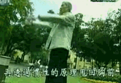 雙腿微屈站立,目微閉,雙手展開,稍用力將兩臂前後甩動。每次甩到第五下的時候,配合膝蓋下蹲。