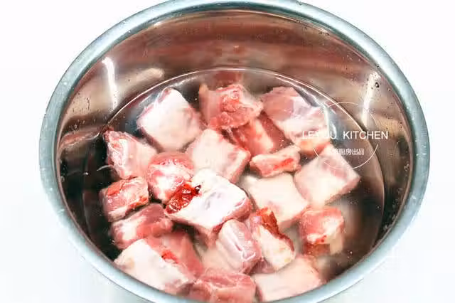 第三步:排骨控干水分,放入薑片、香蔥段、香葉、八角、花椒、1勺老抽、2勺生抽、1勺蚝油、2勺白糖、半勺鹽、1勺料酒、少許胡椒粉調味。