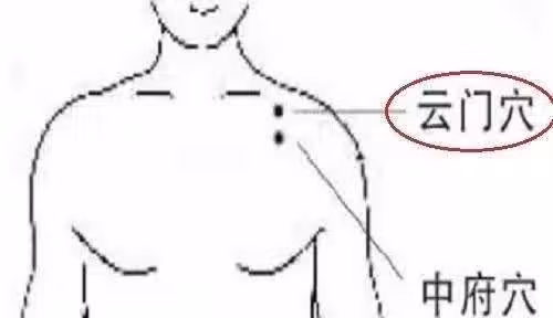 雲門穴在胸前壁外上方,肩胛骨喙突上方,前正中線旁開6寸,身體左右各一,位於鎖骨下窩凹陷處。