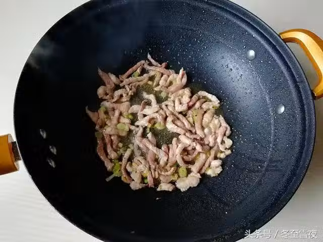 6.下入蔥花,薑末炒香,再下入肉絲翻炒,炒制肉絲顏色變白
