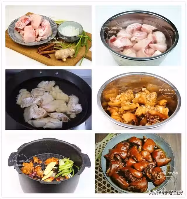 第五步:將豬蹄連帶醬油一起倒入電飯鍋中,再放入冰糖、八角、桂皮、香蔥、薑片、干辣椒、3勺鹽、1大碗清水,然後蓋好鍋蓋,燉煮1個小時,然後燜1個小時。(水的量沒過豬蹄就好。另外,燉煮結束後,如果鍋里的湯汁比較多,可以將整鍋豬蹄連湯一起倒入炒鍋中,大火加熱將湯汁收干一些。)