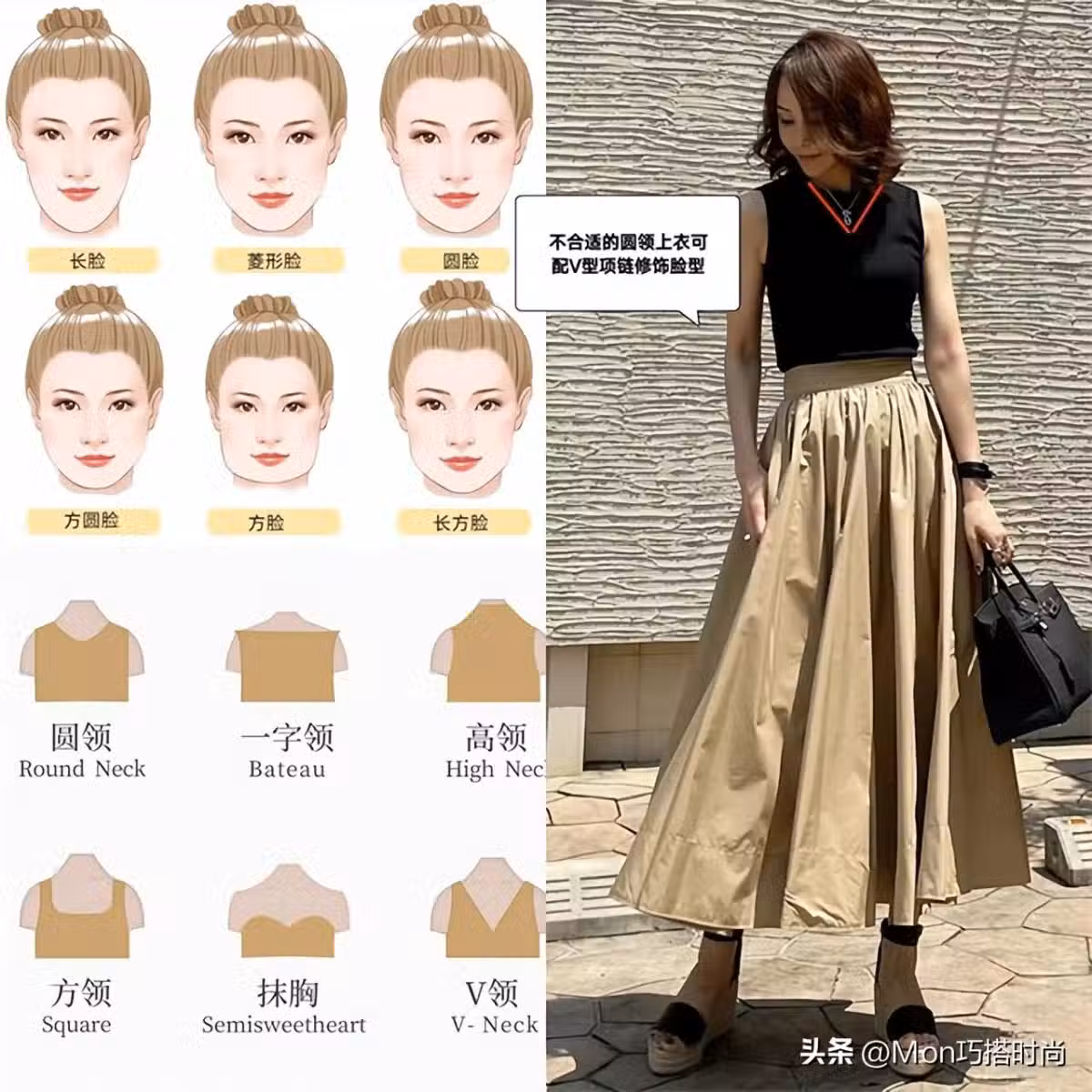 長臉、長方臉多穿高領、半高領和小領口;圓臉,方圓臉和方臉選大圓領、V領和翻領最修飾臉型。如果穿到了不適合自己的圓領和高領上衣,外加一條V型項鏈,同樣能修飾臉型哦~