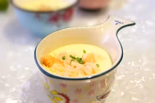 6.蒸蛋羹的時間要根據使用容器的大小和深淺進行調整。蒸製時間合適的蛋羹,表面和內部都沒有任何孔洞,特別嫩滑。如果蒸製時間過長,邊緣和蛋羹內部就會產生小氣孔。