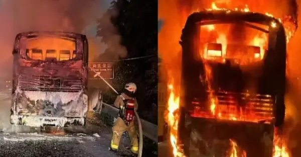 快訊/國道1號「43人客運」火燒車 火海瞬間吞沒車體...