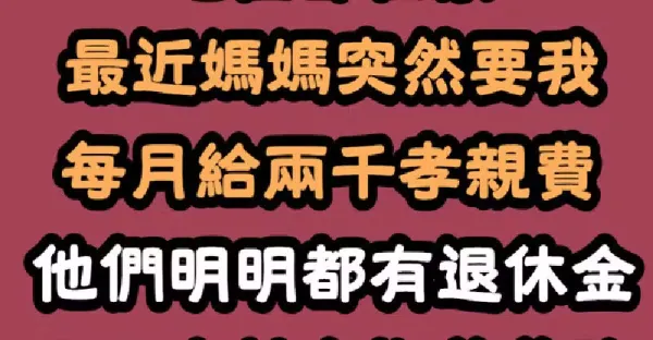 我月薪六萬多,吃住都在家,最近媽媽突然要我「每月給2千孝親費」他們明明都有退休金,而且本來就有撫養義務,我為什麼要給...
