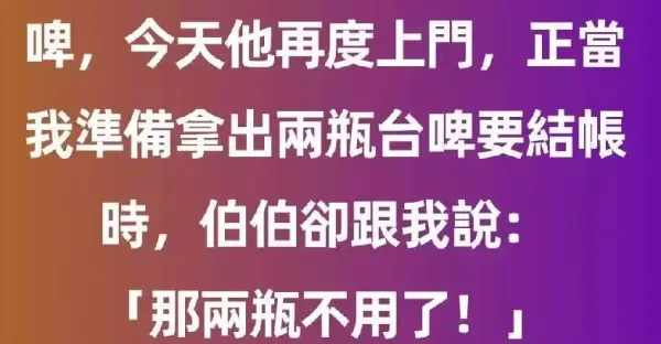 我在超商打工認識一位熟客伯伯,每天都會來買兩瓶台啤,今天他再度上門,正當我準備拿出兩瓶台啤要結帳時,伯伯卻跟我說:「那兩瓶不用了!!」正當我納悶怎麼一回事時,他一開口讓人淚崩了