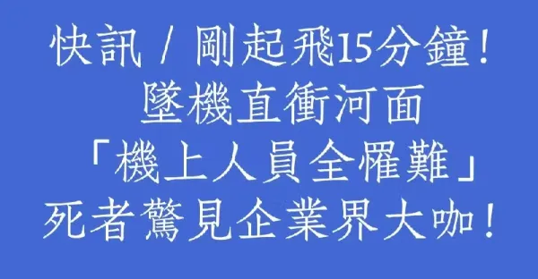 快訊/剛起飛15分鐘!墜機直衝河面「機上人員全罹難」...死者驚見企業界大咖!!