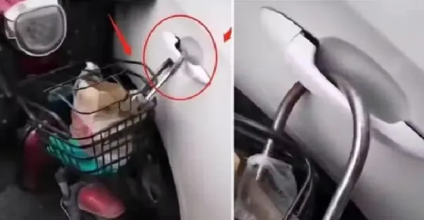 車主亂停車堵住出口,「阿嫲」放大招報復!回來一看車門上掛著一輛電動車, 差點跪下!