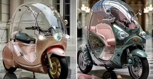 新一代三輪摩托車,外觀設計獨特,可自動伸縮,全透明車體遮風擋雨,前輪自平衡怎麼騎都不倒