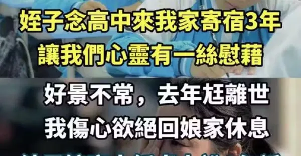 和先生是頂客夫妻,侄子念高中來我家寄宿3年,讓我們心靈有一絲慰藉,好景不常,去年尪離世,我傷心欲絕回娘家休息,結果娘家人飯桌上說1句話,再也沒娘家可回......