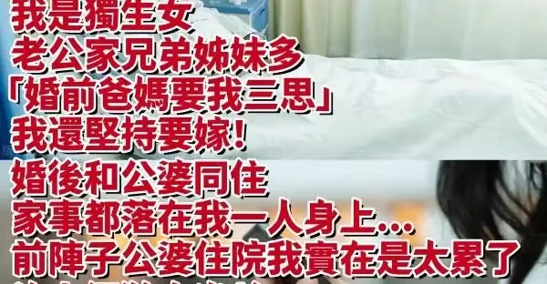 我是獨生女,老公家兄弟姊妹多「婚前爸媽要我三思」我還是堅持要嫁! 婚後和公婆同住,家事都落在我一人身上...前陣子公婆住院我實在是太累了,決定假裝去出差「5天後接到老公電話」我不敢相信自己的耳朵😱