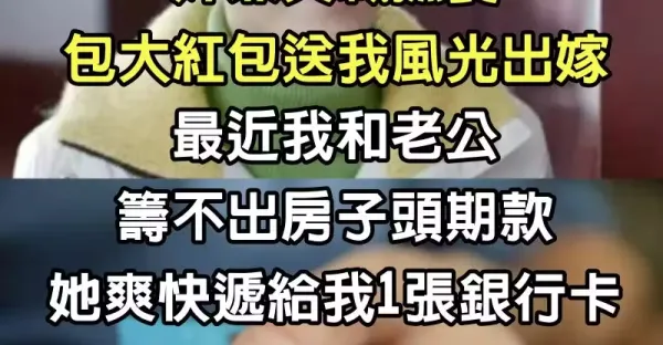 爸爸車禍離世,姊兼父職撫養,包大紅包送我風光出嫁,最近我和老公籌不出房子的頭期款,她爽快遞給我1張銀行卡,姐姐剛走、沒多久姐夫卻來了…