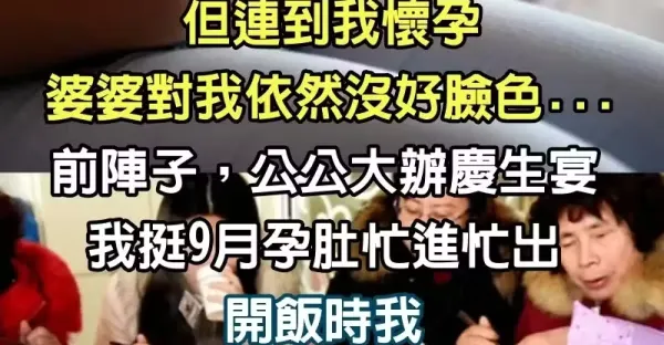 當初老公不顧婆家 反對堅持娶我! 但連到我懷孕 婆婆對我依然沒好臉色……… 前陣子,公公大辦慶生宴 我挺9月孕肚忙進忙出 開飯時我 「當眾放出一段錄音」 婆婆臉綠了!