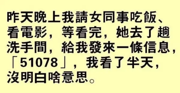 我請女同事吃飯,她去了趟洗手間,給我發來一條信息,「51078」,我看了半天,沒明白啥意思。