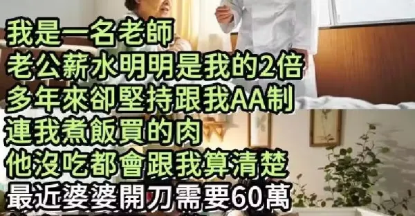 我是老師,老公薪水明明是我2倍,多年來卻堅持跟我AA制,連我煮飯買的肉他沒吃都會跟我算清楚!最近婆婆開刀需要60萬,他竟跟我要30萬說醫藥費也該AA,我終於爆發了...