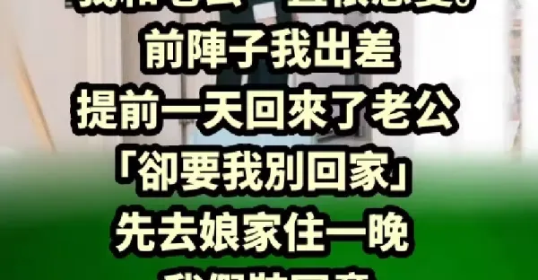 結婚5年,我和老公一直很恩愛。前陣子我出差提前一天回來了,老公「卻要我別回家」先去娘家住一晚,我假裝同意「趕回家一開門」愣住了…