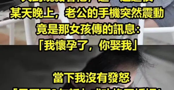 老公公司最近來了一個女新人,一天到晚黏著他,還一起過夜⋯某天晚上,老公的手機突然震動,竟是那女孩傳來的訊息:「我懷孕了,你娶我」。當下我沒有發怒「只回了3句話」,成功挽回婚姻!!