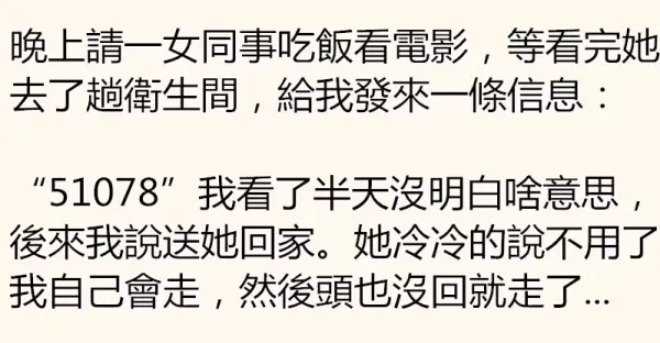晚上我請女同事吃飯,她去了趟洗手間,給我發來一條信息,「51078」,我看了半天,沒明白啥意思…