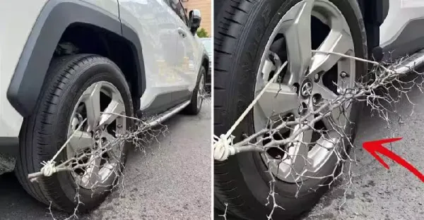 路邊見車輪纏上「奇怪樹枝」,PO圖求問啥用途!懂行網友「1解釋」我瞬間驚呆