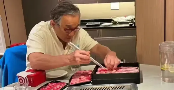 71歲成龍吃火鍋被拍,滿頭白髮戴著老花鏡,胃口不錯,點了好多肉