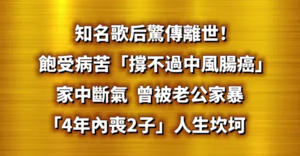知名歌后驚傳離世!飽受病苦「撐不過中風腸癌」家中斷氣 曾被老公家暴「4年內喪2子...」人生坎坷