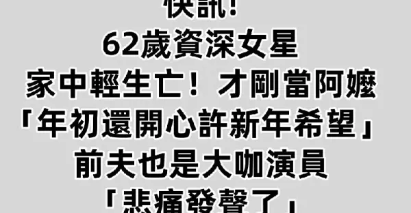 快訊/62歲資深女星家中輕生亡!才剛當阿嬤「年初還開心許新年新希望」 前夫也是大咖演員「悲痛發聲了」!